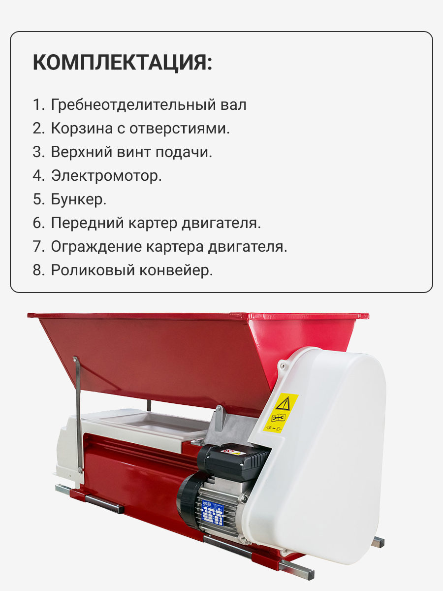 Данная дробилка позволяет экономить время и силы. Гребнеотделитель является неотъемлемым помощником для любого винодела. Измельчитель комплектуется дополнительным наборным пластиковым бункером для увеличения вместимости бункера.